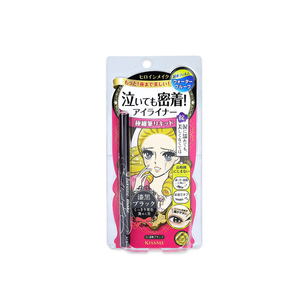 A smudge-proof liquid eyeliner in 01 Jet Black. It is waterproof with its new super waterproof formula, Super-Keep Polymer, that protects lines from tears, perspiration, oils and water, for beautiful, long-lasting definition. It has a 0.1mm extra fine brush that allows anyone to draw with ease. It contains 4 kinds of beauty liquid ingredients that moisturize the eyes. It washes off easily using warm water even though it is resistant to water. Harder to remove lines may be removed with facial cleanser.